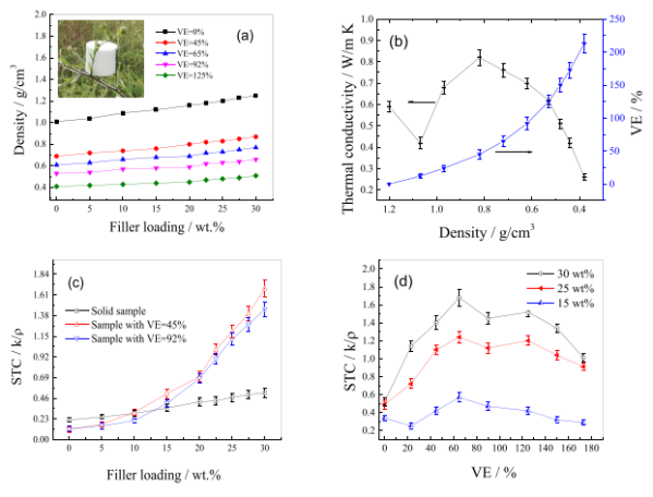 此外,该多孔结构复合材料呈现出明显低于本体聚合物的超低介电常数及损耗,在宽频内保持了极佳的稳定性,以及玻璃化转变温度下的极高的频率及温度稳定性。本研究设计和制作的该超轻聚合物导热复合材料以独特的低密度、超低介电常数及损耗、高比热导率优势在航空及航天电子器件及绝缘散热场合显示了重要的潜在应用价值。
