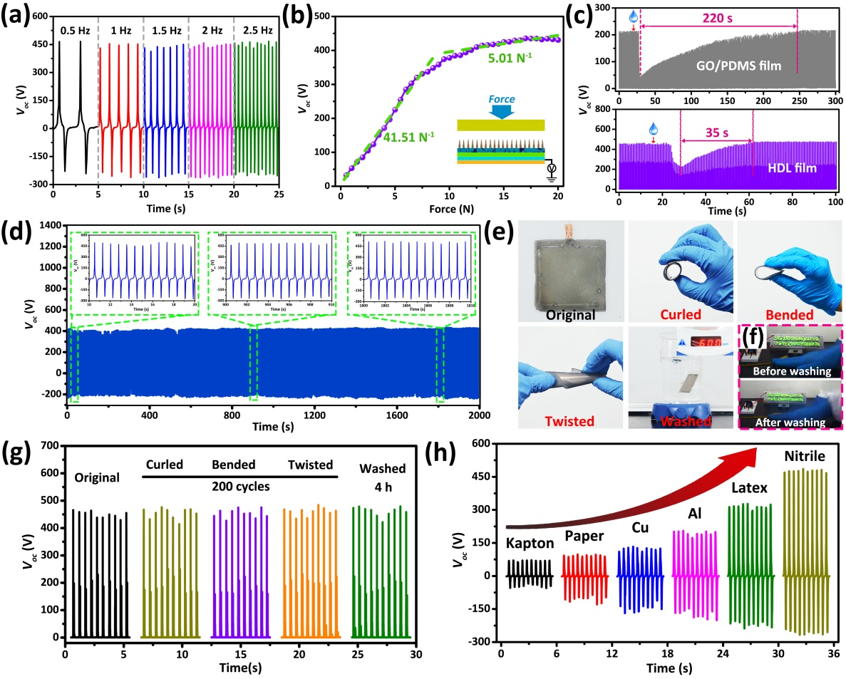 ▲图2 HD-TENG在单电极模式下的耐久性和电输出特性。(a) HD-TENG在0.5到2.5 Hz的不同工作频率下的Voc。(b) HD-TENG的输出电压作为施加压力的函数。(c) GO/PDMS薄膜和HDL薄膜分别置于高湿度环境(~80% RH)时的输出信号恢复过程曲线。(d) HD-TENG的稳定性测量。(e) HD-TENG分别在卷曲、弯曲、扭曲和洗涤下的光学图像。(f) 剧烈水洗涤4小时后HD-TENG仍可点亮LED的照片。(g) HD-TENG在经受各种极端变形和严重洗涤后的Voc。(h) HD-TENG的Voc与不同材料的相对接触分离运动。