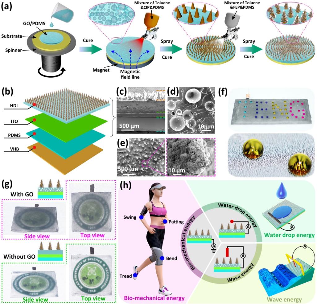 公司屈孟男教授和何金梅副教授研究团队通过简单旋涂和喷涂工艺,并结合磁场辅助,制备了一种新型、高性能超润湿混合电介质基TENG (HD-TENG),实现了各种人体机械能 (例如,步行、手臂摆动和拍手) 和水能 (雨滴和波浪) 的同时收集。值得注意的是,该混合电介质层 (HDL) 同时具有内部微/纳米孔结构和表层微纤毛结构,这极大的提高了其比表面积、可压缩性以及防水特性。通过进一步的结构优化,HD-TENG展现出高柔韧性 (包括各种卷曲、弯曲和扭曲等测试)、优异的耐洗性(4 h水洗)和防潮性(>80% RH)。在单电极模式下,HD-TENG (5 × 5 cm2) 的峰值功率密度可达为 3.2 W m-2。配合电源管理电路可长时间驱动商用低功耗电子设备 (例如计算器和电子表) 工作。此外,在HD-TENG的上表面加载外部电极(Al 或 Cu 电极)以消除界面屏蔽效应。这种升级的配置使得外部电极、内部ITO电极和HDL之间的体效应取代了传统的液-固界面效应,从而促进了电荷转移。结果表明,基于体效应的 HD-TENG 可用于收集自然环境中的水滴能和波浪能,并具有优异的输出效率(最大功率密度分别为215 mW m-2和1.3 W m-2)。该研究为开发可扩展且柔性的多模式TENG并用于自供电的人类活动监测和蓝色能量收集铺平了道路。