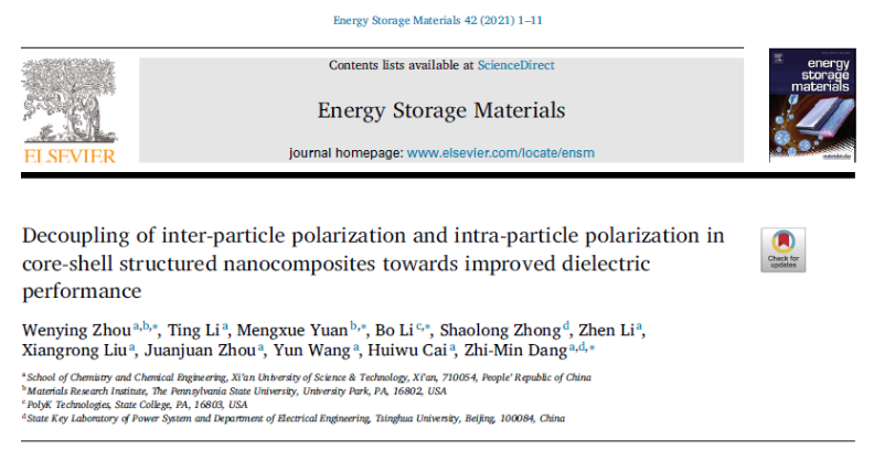 英国365集团官网先进电工材料研究中心在全球储能材料领域的著名刊物 Energy Storage Materials (2020, IF=17.78), 2021,42,1-11上发表了题为“Decoupling of inter-particle polarization and intra-particle polarization in core-shell structured nanocomposites towards improved dielectric performance”的研究论文。