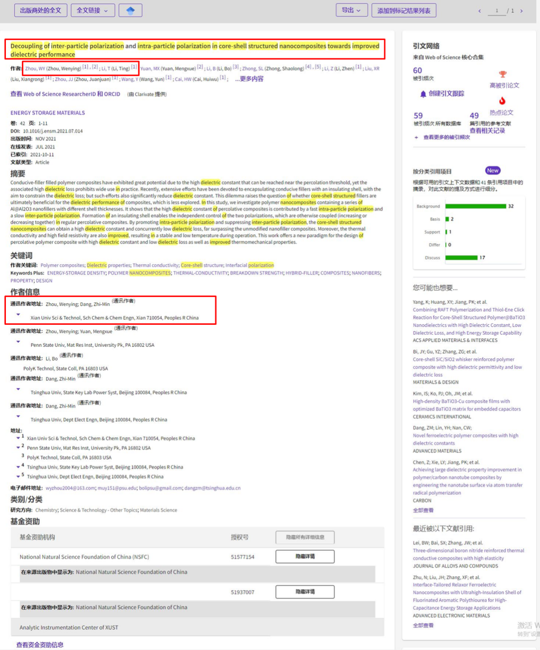 论文信息:Zhou W Y, Li T, Yuan M X, Li B, Zhong S L, Li Z, Wang Y, Liu X R, Zhou J J, Cai H W, Dang Z M. Decoupling of inter-particle polarization and intra-particle polarization in core-shell structured nanocomposites towards improved dielectric performance. Energy Storage Materials, 2021,42: 1-11.