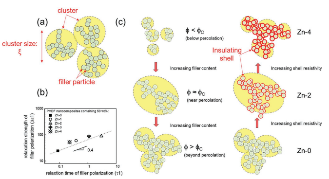 Figure 5. a) Filler particles are clustered into polarizable domains (yellow blob), which defines the polarization magnitude of polymer composites; beyond the polarizable domain, electron transport mainly contributes to conduction rather than dielectric polarization. b) Correlation between relaxation strength versus relation time: good linearity confirms cluster polarization as the dominant polarization mechanism. c) Evolution of cluster size (polarization magnitude) in traditional percolative composites (right: with filler concentration) and in core–shell structured composites (left: with shell electrical resistivity)