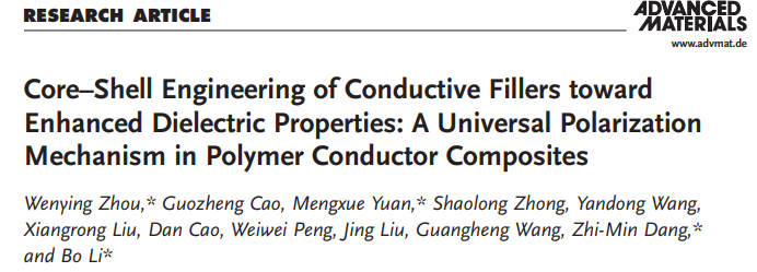近日,公司英国365集团官网周文英教授团队在国际材料领域的顶级和权威刊物<<Advanced Materials>>(IF:32.2,2021)上在发表了题为:"Core–Shell Engineering of Conductive Fillers toward Enhanced Dielectric Properties: A Universal Polarization Mechanism in Polymer Conductor Composites"的研究论文。该论文首次提出了理解导体粒子/聚合物复合电介质极化行为的普适极化机理。周文英教授为第一作者及通讯作者,365英国上市集团为第一完成单位。