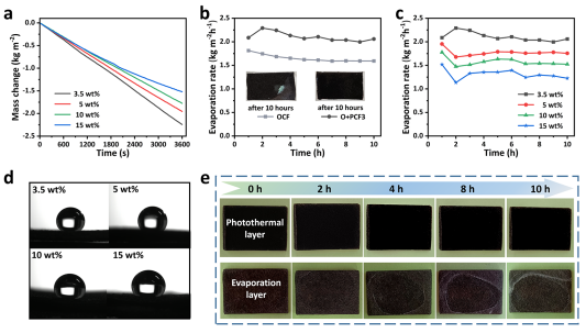 图2.(a)在1个太阳光照下O+PCF3在ISVG期间不同浓度的盐水的质量变化。(b)在1个太阳光照射下,OCF和O+PCF3在3.5 wt% NaCl溶液中连续10 h ISVG期间的蒸发速率(插图是10 h后其顶部光热界面处的盐沉积现象)。(c)O+PCF3在1 h下连续10 h ISVG期间不同浓度盐水中的蒸发速率和(d)10 h后它们的水接触角。(e)在1个阳光照射下连续10 h在15 wt% NaCl水溶液中进行ISVG期间O+PCF3的照片。