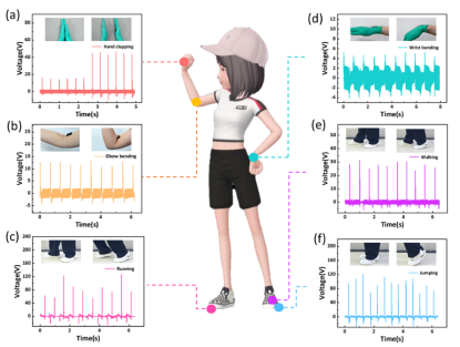 图2 HPC-TENG作为自供电传感器固定在人体的各个部位,以监控运动状态产生的输出电压。(a)拍手(b)肘部弯曲(c)跑步(d)手腕弯曲(e)行走(f)跳跃。