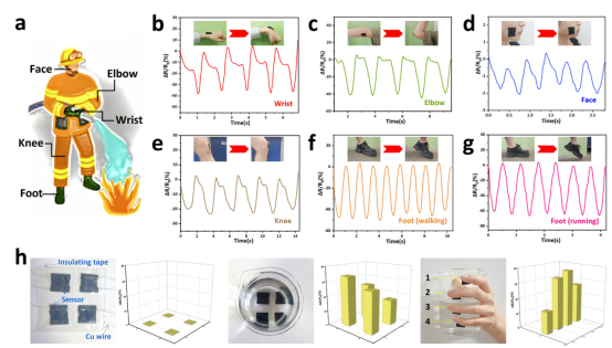 图2.(a)HPCF粘附在消防员身体各部位进行感应的示意图。(b-g)HPCF传感器实时监测手腕、肘部、面部、膝盖以及步行和跑步过程中连续运动期间脚部的相对阻力变化。(h)2 × 2传感器阵列响应图和光学图像,对应于含水烧杯放置和抓取烧杯的压力分布。