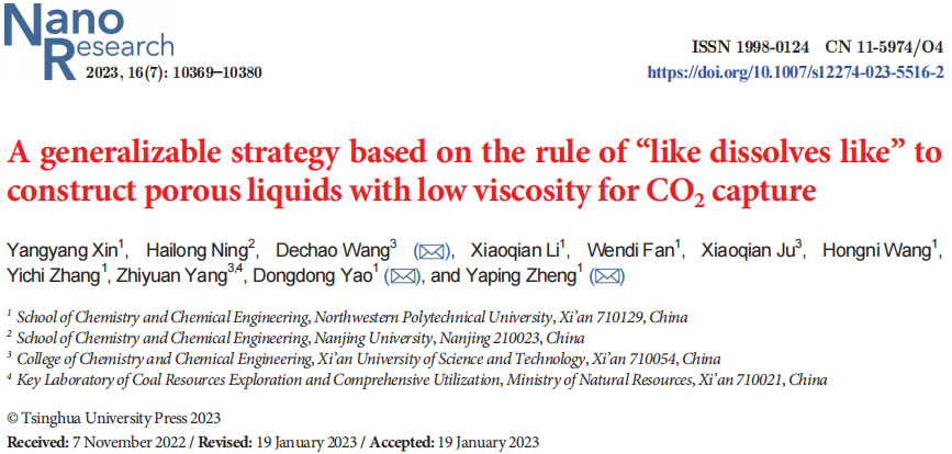 文章链接:Yangyang Xin, Hailong Ning, Dechao Wang*, XiaoqianLi, Wendi Fan, Xiaoqian Ju, Hongni Wang, Yichi Zhang, Zhiyuan Yang, Dongdong Yao*, and Yaping Zheng*.A generalizable strategy based on the rule of “like dissolves like” to construct porous liquids with low viscosity for CO2capture[J].Nano Research, 2023: 16, 10369-10380.https://doi.org/10.1007/s12274-023-5516-2(中科院一区TOP,IF=10.0,中国科技期刊卓越行动计划—领军期刊)