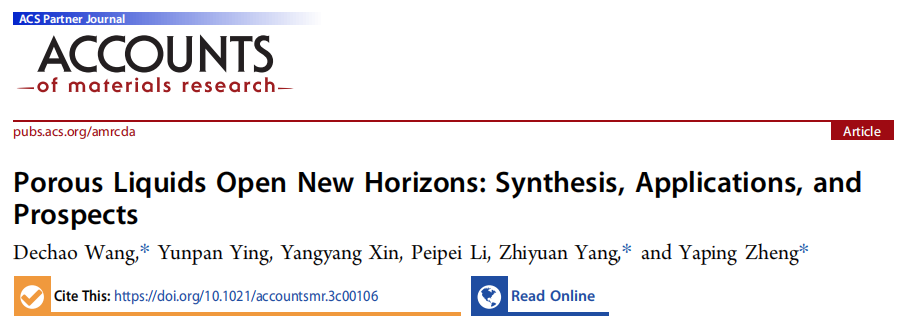 文章链接:Dechao Wang*, Yunpan Ying, Yangyang Xin, Peipei Li, Zhiyuan Yang*,and Yaping Zheng*. Porous Liquids Open New Horizons: Synthesis, Applications, and Prospects[J].Accounts of Materials Research, 2023, 4(10): 854-866.https://doi.org/10.1021/accountsmr.3c00106(IF=14.6,入选期刊封面论文)