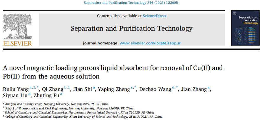 文章链接:Ruilu Yang*, Qi Zhang, Jian Shi, Yaping Zheng*,Dechao Wang*, Jian Zhang, Siyuan Liu, and Zhuting Fu. A novel magnetic loading porous liquid absorbent for removal of Cu(II) and Pb(II) from the aqueous solution[J].Separation and Purification Technology, 2023, 314: 123605.https://doi.org/10.1016/j.seppur.2023.123605(中科院工程技术一区TOP,IF=8.6)