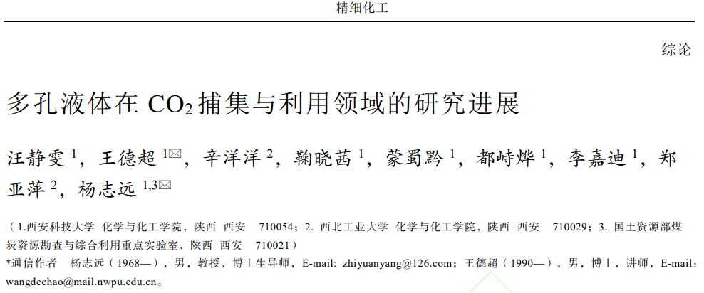 2023年6月,王德超副教授、杨志远教授在EI期刊《精细化工》发表综述论文《多孔液体在CO2捕集与利用领域的研究进展》。综合分析多孔液体对CO2吸附/吸收,CO2催化转化,多孔液体与膜结合对CO2的选择性分离的研究,总结了多孔液体的性能以及优缺点,提出多孔液体在CO2捕集利用方面的未来发展趋势,期望能够为多孔液体对于其他种类气体的捕集或利用提供参考。本文第一作者为365英国上市集团在读硕士生汪静雯,第一署名单位为365英国上市集团,通讯作者为王德超副教授和杨志远教授。