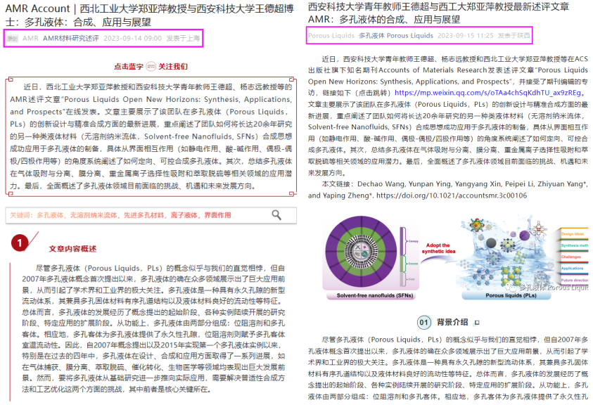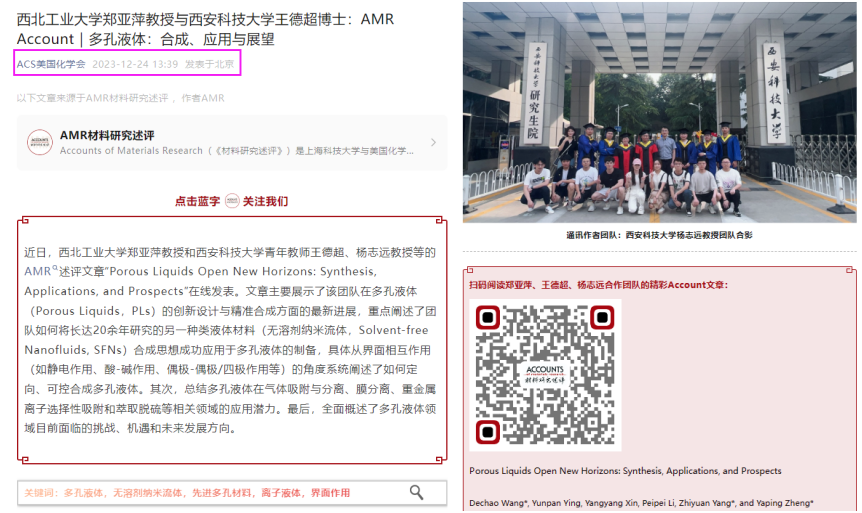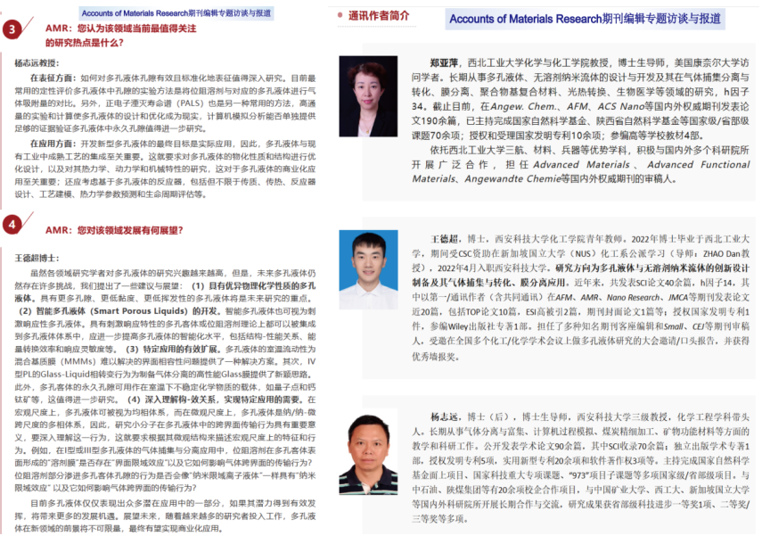 (1)成果一:青年教师王德超在多孔液体领域取得重要进展,发表在ACS出版社旗下知名期刊Accounts of Materials Research,并受到了期刊主编专题访谈与ACS美国化学会官方报道