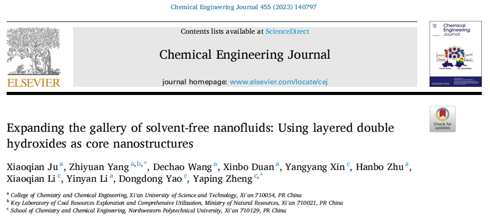 文章链接:Xiaoqian Ju,ZhiyuanYang*,DechaoWang,Xinbo Duan, Yangyang Xin,Hanbo Zhu, Xiaoqian Li,Yinyan Li, Dongdong Yao,and Yaping Zheng*.Expanding the gallery of solvent-free nanofluids: Using layered double hydroxides as core nanostructures[J].Chemical Engineering Journal, 2023, 455: 140797.https://doi.org/10.1016/j.cej.2022.140797(工程技术一区TOP,IF=15.1)