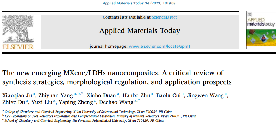 文章链接:Xiaoqian Ju,Zhiyuan Yang*, Xinbo Duan,Hanbo Zhu, Baolu Cui,Jingwen Wang, Zhiye Du, Yuxi Liu, Yaping Zheng,and DechaoWang*. The new emerging MXene/LDHs nanocomposites: A critical review of synthesis strategies, morphological regulation, and application prospects[J].Applied Materials Today, 2023, 34: 101908.https://doi.org/10.1016/j.apmt.2023.101908(一区TOP,IF=8.3)