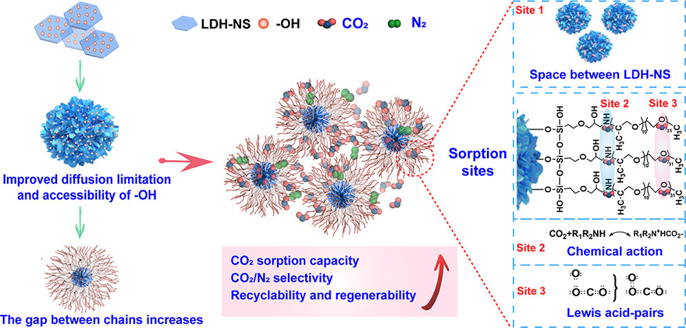 2023年1月,杨志远教授联合西北工业大学郑亚萍教授报道了一种将水滑石(LDHs)转化为一种新型的稳定、均匀的LDHs纳米流体(LDH-F)的通用策略。通过共价键将颈冠层接枝在LDHs纳米片(LDH-NS)表面,获得的LDH-F结合了流动性与LDHs纳米片的功能,并通过实验和模拟方法明晰了CO2选择性吸附位点,制备的LDHs基无溶剂纳米流体有望应用于高效碳捕集与选择性分离领域。本文第一作者为365英国上市集团在读博士鞠晓茜,第一署名单位为365英国上市集团,通讯作者为杨志远教授和郑亚萍教授。