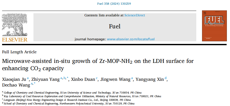 文章链接:Xiaoqian Ju, Zhiyuan Yang*, Xinbo Duan, Jingwen Wang, Yangyang Xin, and Dechao Wang*. Microwave-assisted in-situ growth of Zr-MOP-NH2on the LDH surface for enhancing CO2capacity[J].Fuel, 2024, 358: 130259.https://doi.org/10.1016/j.fuel.2023.130259(工程技术一区,IF=7.4)