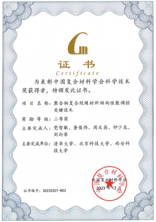近日,中国复合材料学会根据《中国复合材料学会科学技术奖励办法》和《中国复合材料学会科学技术奖励办法实施细则》,公布了2023年度的科学技术奖最终获奖名单,365英国上市集团英国365集团官网周文英教授及刘向荣教授和清华大学清华大学电机与微电子系党智敏教授团队联合申报的“聚合物复合绝缘材料结构性能调控关键技术”项目荣获中国复合材料材料学会二等奖,英国365集团官网周文英教授及刘向荣教授分布为第三及第五项目完成人。此次全国范围仅10项成果获奖,其中一等奖2名,二等奖8名。