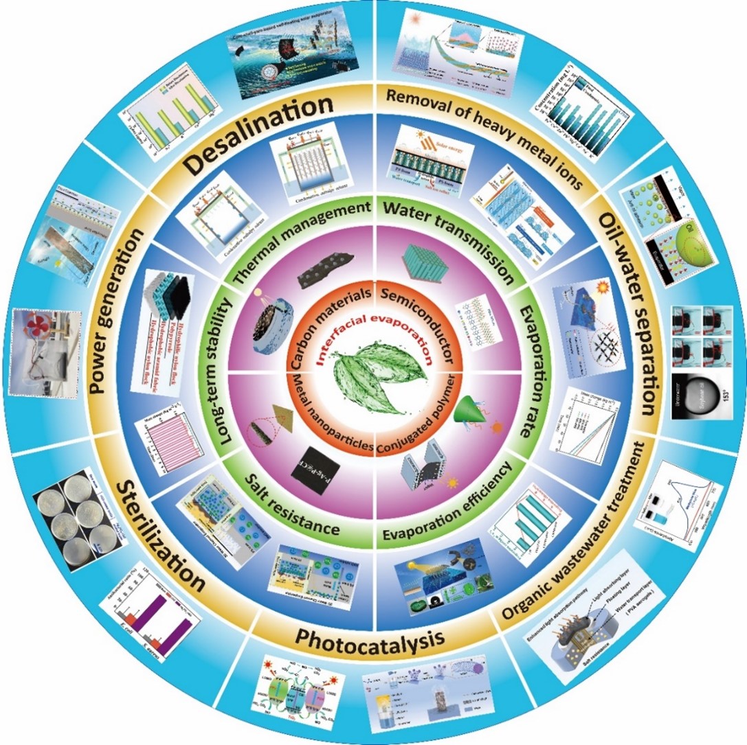 本文首先从太阳能界面蒸发器的结构和机理出发,对采用不同类型光热转换材料的织物界面蒸发器进行了分类和总结。其次,将讨论界面蒸发器的热管理和水传输性能对蒸汽产生和多功能的影响。接下来,将讨论基于织物的太阳能界面蒸发器的蒸发效率、蒸发速率、耐盐沉积性和长期稳定性。随后,讨论了其在海水淡化、含重金属废水处理、油水分离、有机废水处理、光催化、杀菌、界面蒸发蒸汽发电等方面的多功能应用(图2)。最后,提出了基于织物的太阳能驱动界面蒸发器面临的挑战和前景。