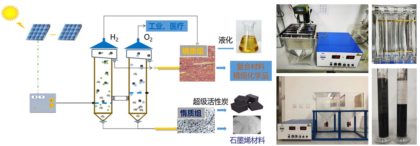 神府煤煤质优良,是优质的化工原料用煤,但其显微组分组成复杂,丝质组含量高,严重制约了其高效加工利用效能和转化率。通过分选以获得相对富集的煤显微组分,根据各组分性能特征,进行分质低碳化高效利用,其中富镜质组分和壳质组分用于热解,直接液化和气化,富丝质组分用于制备新型碳材料。本技术成果借助陕北地区丰富的太阳能资源优势,开发了以电解浮选为核心的神府煤显微组分分选并联产绿氢的多联产技术,该技术结合太阳能发电,可以高效制备绿氢,提高煤转化的油产率和油气品质,具有煤显微组分分离纯度高,绿氢产率高,能耗低,工艺简单,经济性强,绿色环保等技术优势。