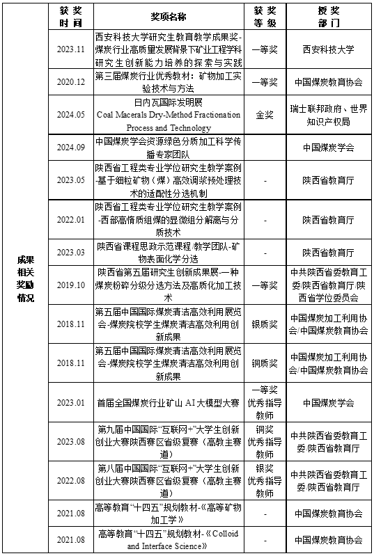 ① 思政引领出成效,团队队伍上台阶:基于成果模式,获得省级课程思政示范课程、煤炭行业科学传播团队及教学成果奖等6项,出版“十四五”规划教材3部。聘请20余位高校/企业专家,团队获校级师德先进集体和先进个人、特色员工党支部、“五好”导学团队,成为首批师德示范工作站建设单位。