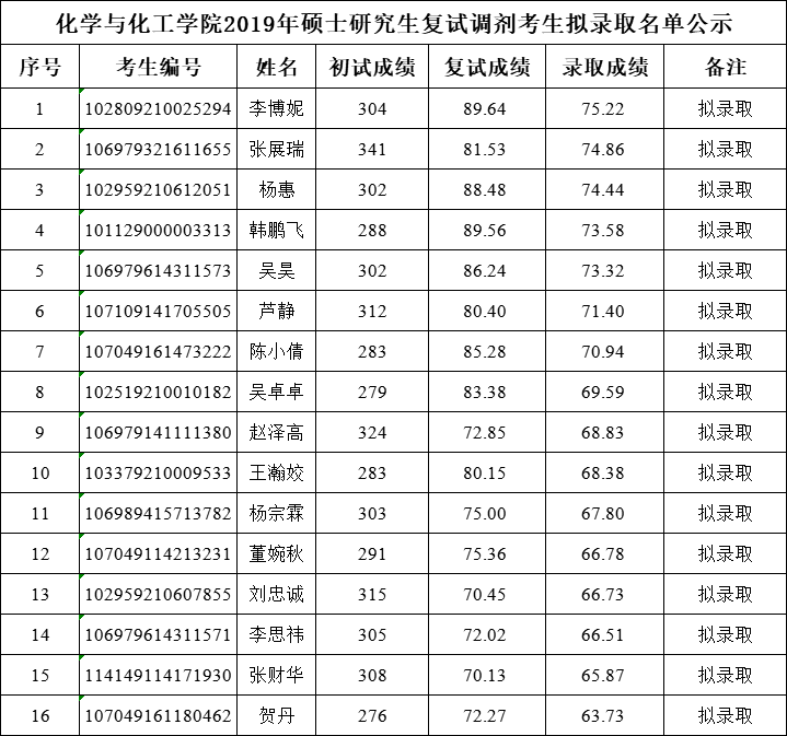 2019年硕士研究生复试调剂考生拟录取名单公示