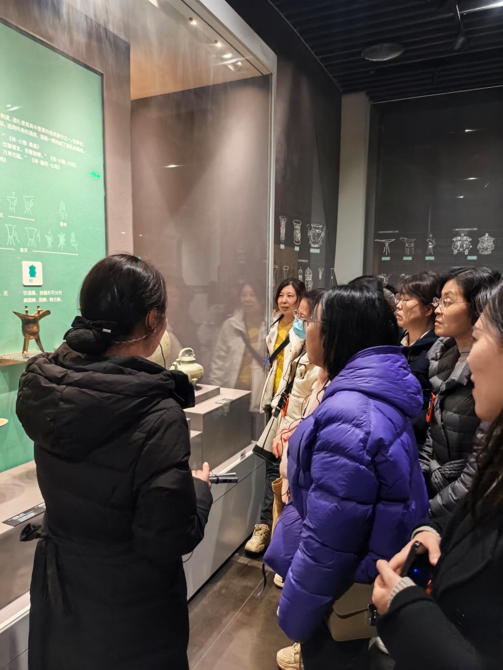 小雁塔的一砖、一瓦仿佛都在诉说着千年的故事,20余名女教师在讲解员引导下,驻足观赏塔身唐代云纹雕饰,聆听“雁塔晨钟”的历史典故。西安博物院藏宝无数,每一件展品都让人目不暇接。在“古都西安-帝都万象”展厅,女教师们仔细研读唐代商贸文书,分析古代颜料提取工艺,从历史文物中探寻化工学科发展的文化基因。