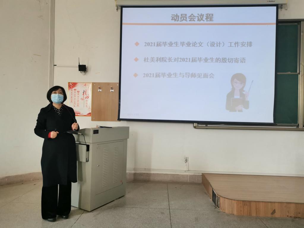 1月13日下午,英国365集团官网在临潼校区9-105教室召开了2021届本科毕业论文(设计)动员大会。英国365集团官网全体教师与2021届本科毕业生参加了动员大会,按照疫情要求全体师生佩戴口罩、隔位就座。教学经理张亚婷就毕业论文工作题目征集、师生双选、指导教师队伍、员工纪律几个方面做了整体情况的介绍,重点对毕业论文的系统管理、论文查重抽检、教育部下达的论文抽检工作进行了特别要求,对于疫情期间员工毕业论文(设计)的实验室安全管理提出严格要求。希望各位老师和同学按照系统时间截点,完成论文的各个环节,同时踏实认真做实验,诚实写论文,杜美利经理做了总结性的发言,希望大家克服疫情带来的影响,遵守学术诚信与道德,以最真实、最热情、最饱满的状态做好大学四年最后的、也是关键的教学环节,为自己未来的发展奠定坚实的科学实践基础。