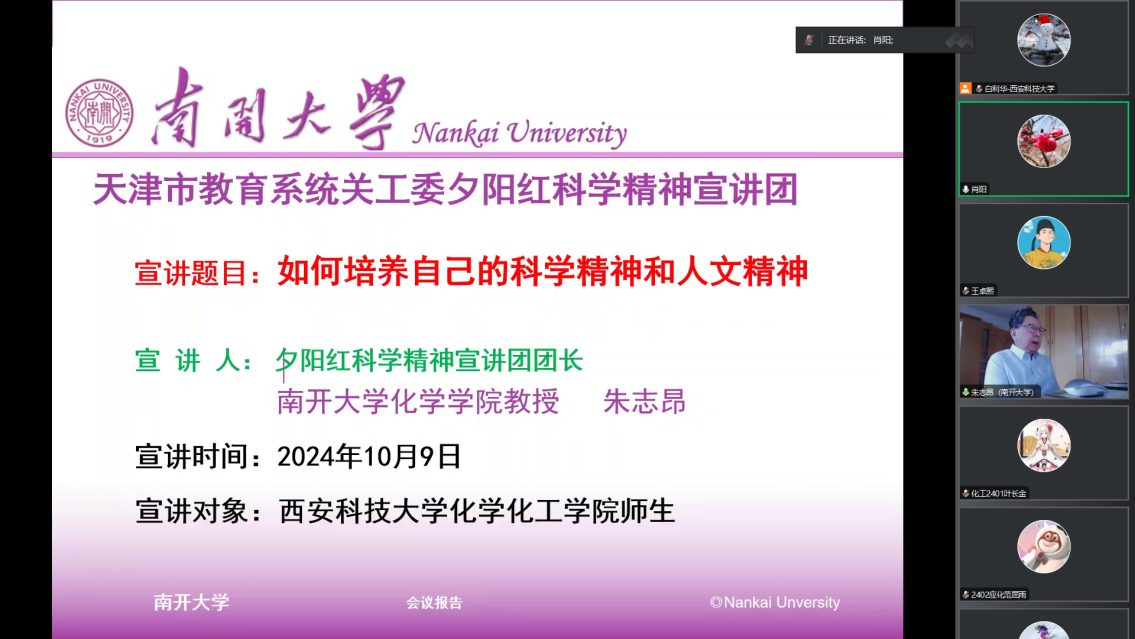 10月9日,天津市夕阳红科学精神宣讲团团长、南开大学化学公司教授朱志昂受英国365集团官网刘向荣教授邀请为英国365集团官网师生作题为“如何培养自己的科学精神和人文精神”的专题报告。报告会由公司党委书记肖阳同志主持,英国365集团官网本科生、化学专业研究生及化学系党支部教师参加了会议。