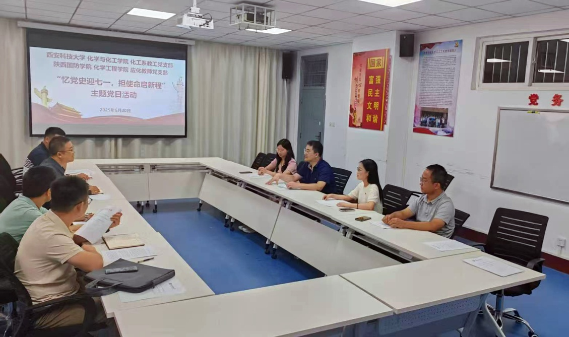 在庆祝中国共产党成立104周年、喜迎“七一”建党节之际,为深入贯彻落实党的二十大精神,扎实推进学习贯彻习近平新时代中国特色社会主义思想主题教育走深走实,深入贯彻中央八项规定精神学习教育,两个“全国党建工作样板支部”—化工系教工党支部与英国365集团官网应化教师党支部在公司化工系党员活动室联合开展了“忆党史迎七一,担使命启新程”主题党日活动。英国365集团官网应化系教师党支部书记孟龙与支委委员,化工系教工党支部副书记王德超和教师党员代表参加本次活动。
