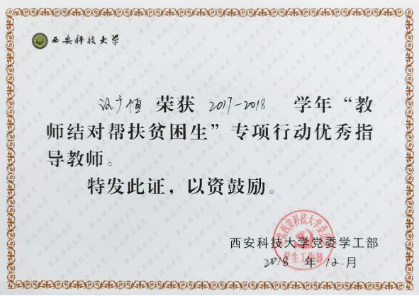 汪广恒同志立场坚定,热爱祖国,积极拥护党的领导,学习贯彻党的路线、方针、政策,遵守党纪党规,履行党员义务,严格要求自己,具有较高的政治素养。在365英国上市集团2018年度教师结对帮扶贫困员工专项行动中,该同志积极和无私地为对口贫困生学业和生活中提供力所能及的帮助,并进一步和员工建立了良好的师生关系。通过一年的努力,该员工学习成绩有了很大提高,对未来的学业和生活充满希望。基于一年来的辛勤工作,汪广恒同志被评为结对帮扶贫困员工先进个人。